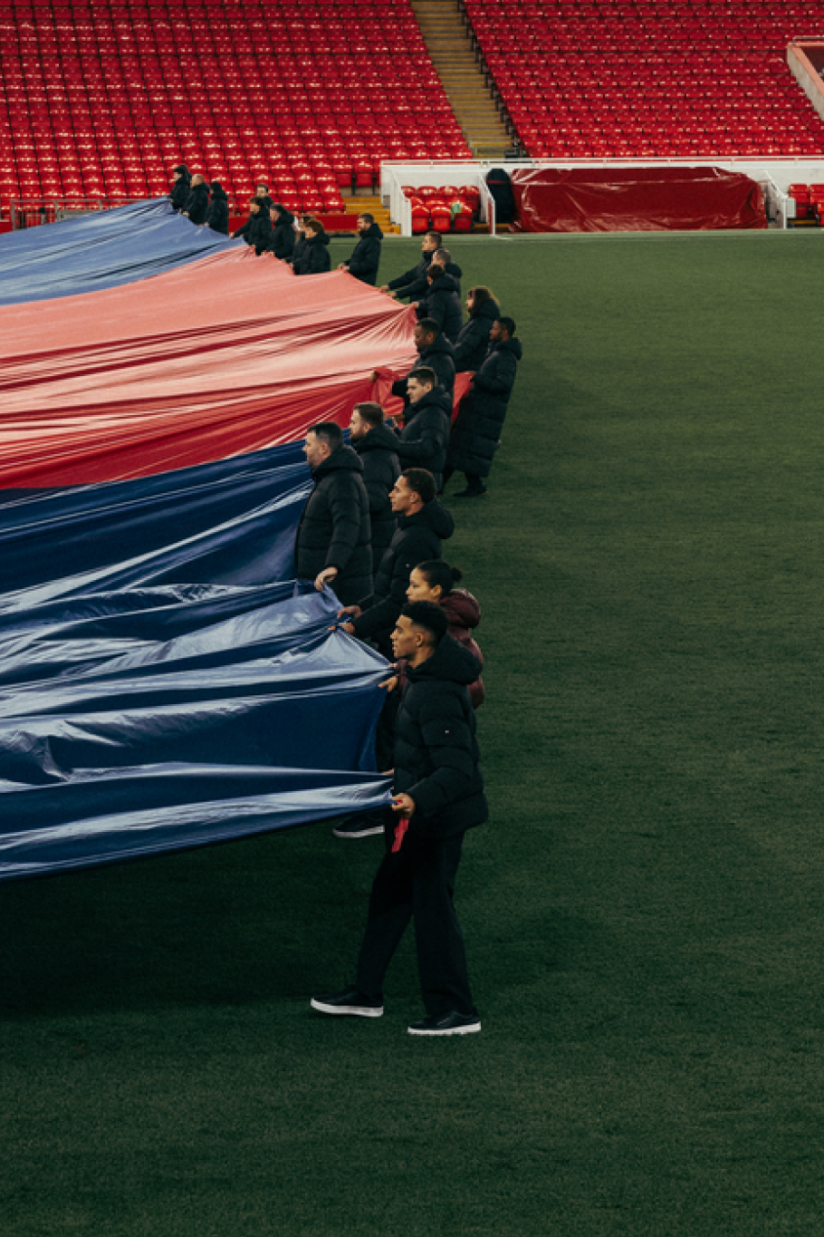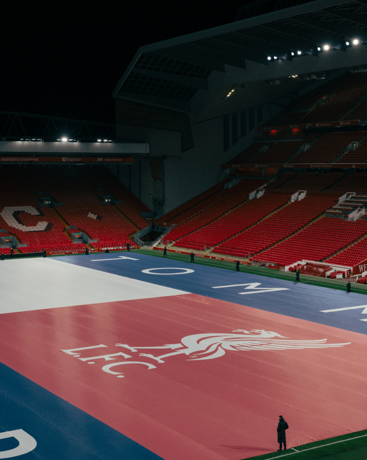 100 m de long, plus de 100 h de travail : le plus grand drapeau TH a annoncé ce partenariat au stade d’Anfield.
