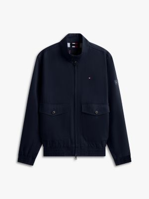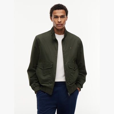 Cette veste Harrington contemporaine en tissu de coton mélangé présente une doublure intégrale contrastée et un écusson logo.