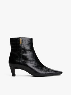 Deze statement-enkelboots met een all-over kroko-textuur hebben een glanzende afwerking en een stylish kitten heel.