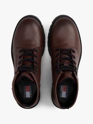 Dit halfhoge veterlaarsje van leer met een chunky profielzool heeft een rubberen Tommy-badge als branded accent.