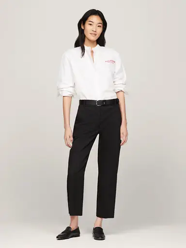 Het is misschien tijd om je ideeën over dames chino’s te herzien. Tommy Hilfiger verlegt de grenzen van het chino design. Ontdek de relaxed fit enkellange chino's verfraaid met geborduurd monogram in een all-over patroon en plooien aan de voorkant. Trendy en modieuze looks die de grenzen tussen formele en casual styling doen vervagen. Bekijk vervolgens Tommy Hilfigers chino broek met hoge taille en monogram, die de 'smart' in smart-casual kleding onderstreept.