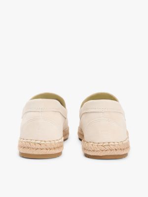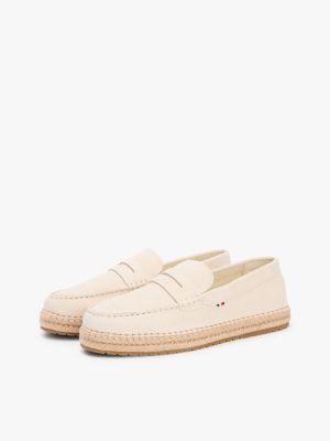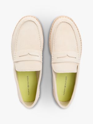Deze suède espadrilles met een jute tussenzool hebben klassieke penny-bandjes voor een moderne versie van de traditionele loafer.