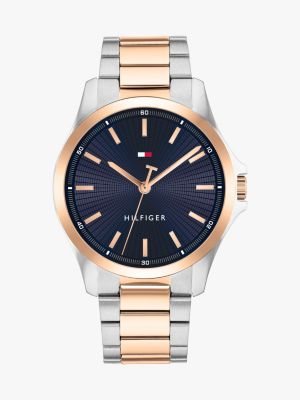 De horlogeband met rosévergulde en roestvrijstalen schakels geeft dit horloge met marineblauwe wijzerplaat een luxe uitstraling.